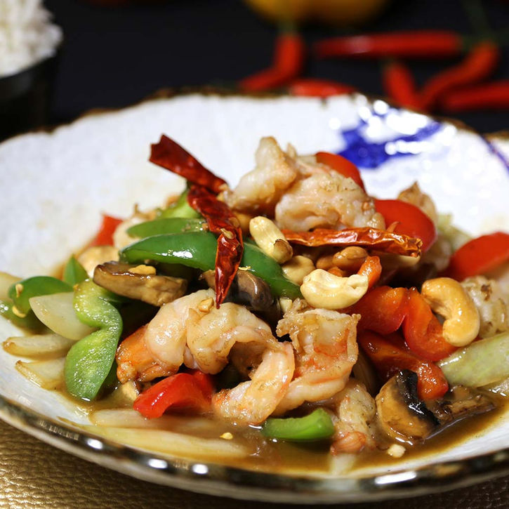 Wok-tossed chicken or shrimp with roasted cashews, bell peppers, onions, and carrots in a light, savory-sweet sauce.