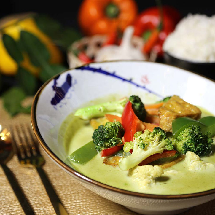 A creamy Thai coconut soup with lemongrass, galangal, kaffir lime leaves, and fresh chili, served with your choice of vegetables, chicken, or shrimp.